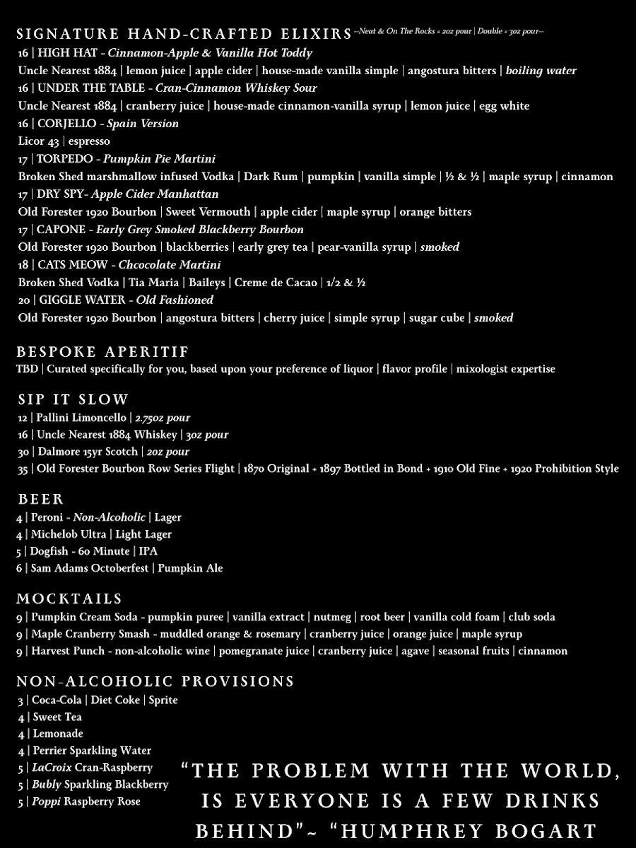 But what truly sets The Cured Plate apart are its Signature Hand-Crafted Elixirs, a showcase of creativity and seasonal flair. Each cocktail feels like a story in a glass-an artful reflection of flavor and imagination. “On the Payroll,” a Pear & Vanilla Gin Fizz, is a refreshing twist that combines botanical smoothness with a subtle sweetness, ideal for a sunny afternoon. “The Noble Experiment,” their Fig Bee’s Knee’s, marries the earthiness of fig with honeyed citrus for a sophisticated sip. “Omertà,” the Fall Bellini, evokes autumn warmth with every sparkling note, while “Flapper,” a White Pumpkin Martini, captures the spirit of the season with creamy spice and nostalgic comfort. Then there’s “Luciano,” an Amaretto Dirty Chai, which feels like dessert and cocktail in one-nutty, aromatic, and soul-soothing. Each drink has its own personality, crafted with precision and presented with flair, embodying the bar’s balance between nostalgia and innovation.
